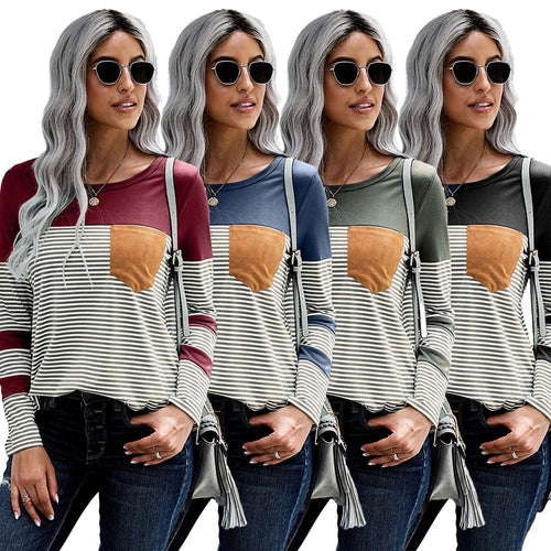 Women Striped Stitching Contrast Color Long Sleeves Slim Slim T-shirt